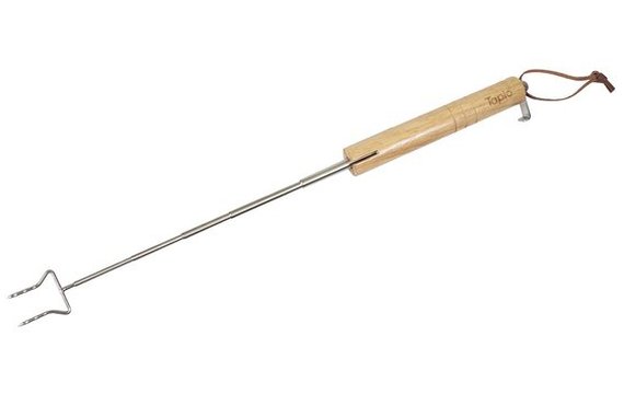 Tämä makkaratikku on täydellinen seuralainen nuotiolle. Teleskooppitikku tuntuu mukavalta kädessä puisen kädensijansa ansiosta. Tikun päässä on nahkalenkki ja pullonavaaja. Tikun pituus avattuna 77,5 cm ja suljettuna vain 17 cm, joten se kulkee kätevästi mukana repussa. Vihti -logo laserkaiverruksella.